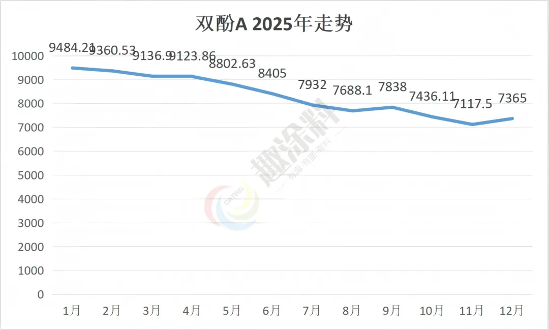 进入2025年,双酚A市场进入"产能过剩"周期。全年新增产能达60万吨,总产能突破635万吨,但下游PC和环氧树脂行业产能利用率分别仅为74%和68%,供需失衡加剧。价格走势呈现"阶梯式下探"特征: