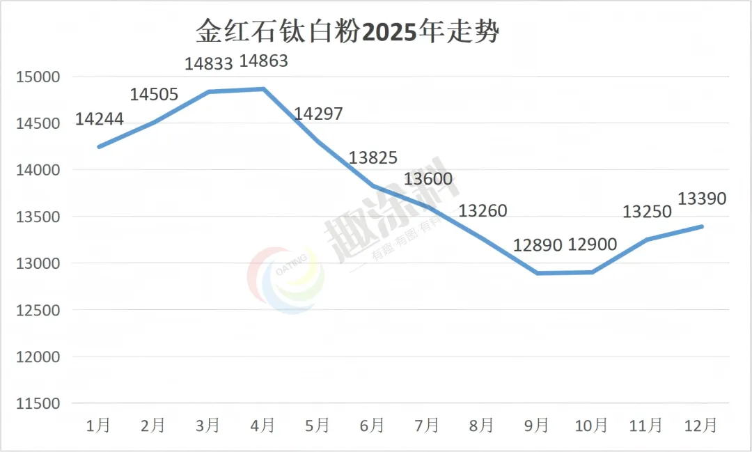 2025年,金红石型钛白粉市场在供需失衡与成本压力的双重挤压下,价格呈现“先抑后扬”走势,全年均价较2024年下跌约10%,年末价格较年初下降6.7%。