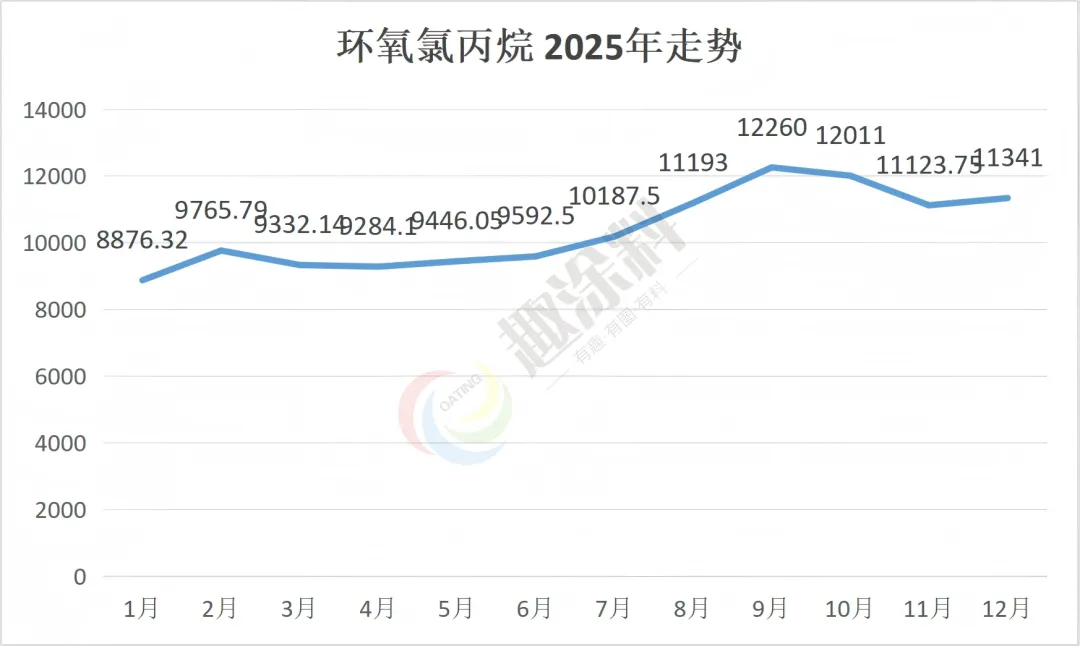 2025年,环氧氯丙烷市场在成本推动与供需博弈中走出“V型”行情,全年均价同比上涨28.73%,创下近四年最大年度涨幅。价格从年初的8876元/吨震荡攀升至9月峰值12260元/吨,随后在四季度回落至11341元/吨,全年价格波动幅度达3384元/吨,较2024年显著扩大。