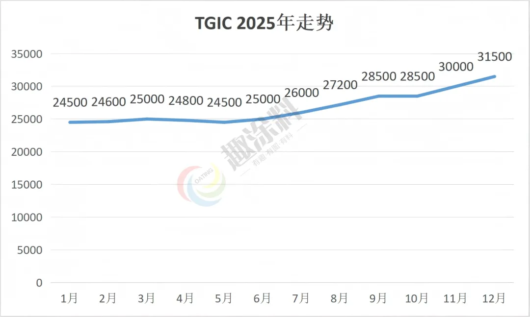 2025年,TGIC(异氰脲酸三缩水甘油酯)固化剂市场在经历连续三年价格下行后,于下半年迎来显著反弹,全年价格呈现“先抑后扬”的V型走势。数据显示,2025年TGIC市场均价较2024年上涨约25%,其中四季度均价突破3万元/吨,创2023年以来新高。