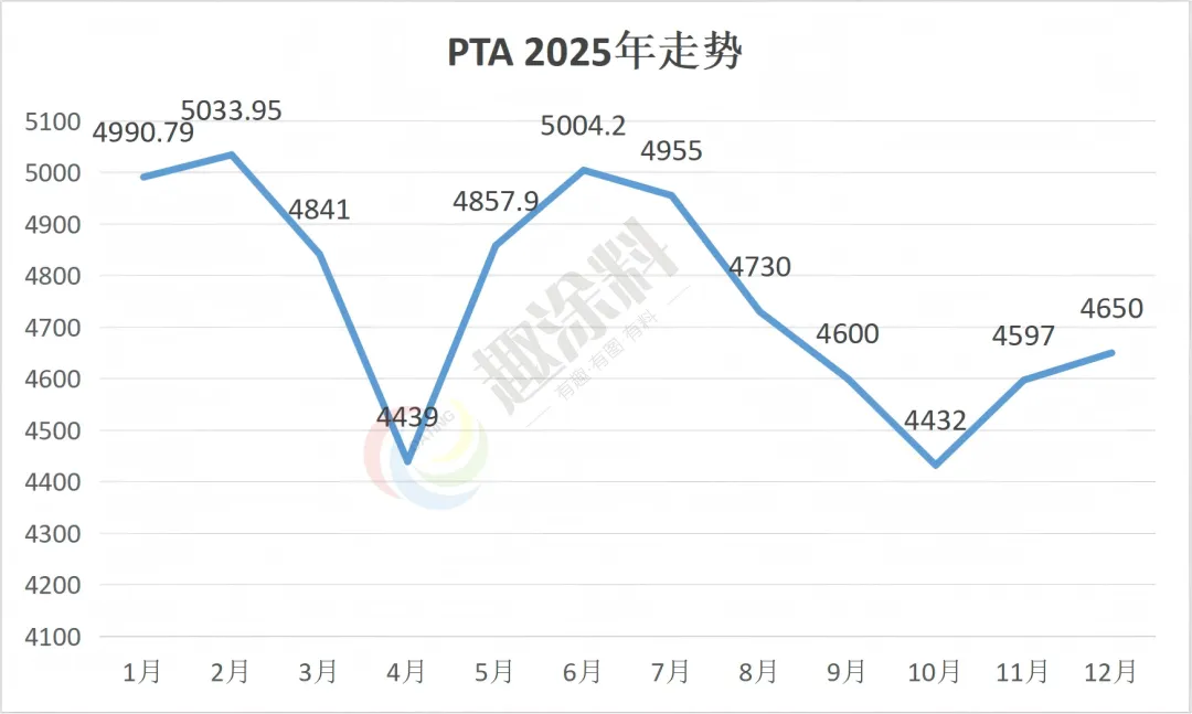 2025年,PTA市场在产能持续扩张、成本端剧烈波动与需求端弱复苏的多重博弈中,呈现“先抑后扬”的震荡格局。全年均价较2024年下跌约15%,价格中枢下移至4500-5000元/吨区间,12月收盘价4650元/吨,较年初下跌6.8%。