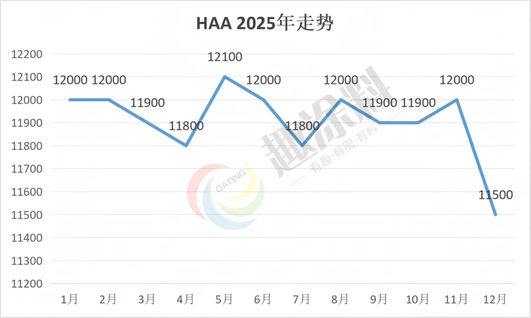 四季度,行业龙头企业通过降低开工率(行业平均开工率降至55%,同比减少8个百分点)缓解库存压力,叠加原料新戊二醇价格因环保限产企稳,HAA价格在11月短暂反弹至12000元/吨后,因年末需求清淡再度回落至11500元/吨,全年价格波动幅度收窄至800元/吨,较2024年(波动幅度1500元/吨)显著减小。
