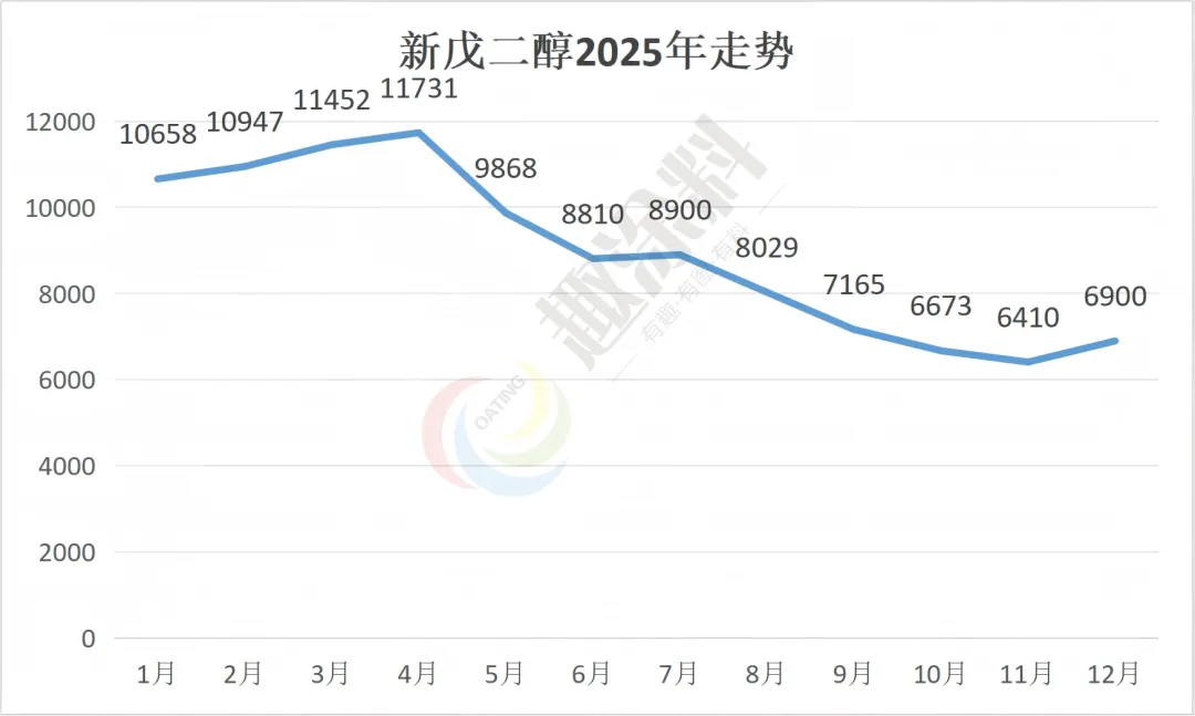 2025年,新戊二醇市场经历了剧烈的价格波动,全年价格从年初的10658元/吨飙升至4月峰值11731元/吨后急转直下,12月跌至6900元/吨,全年跌幅达35.2%,创下近四年最大年度跌幅。