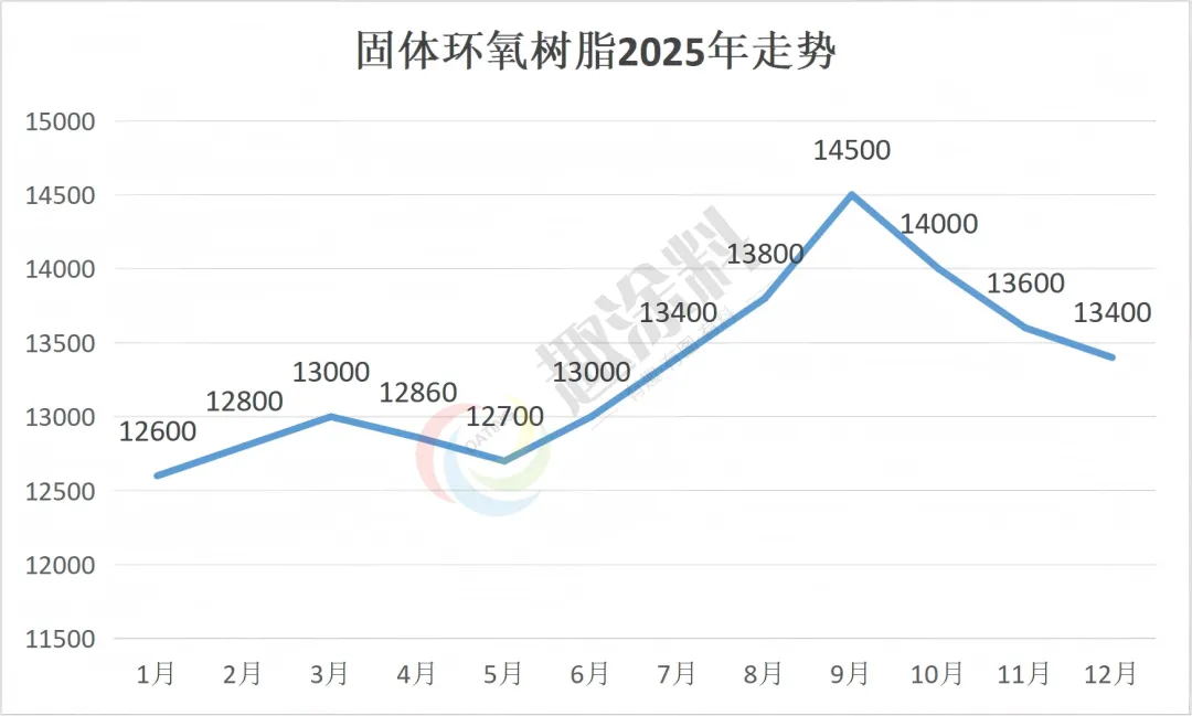 三季度进入传统需求旺季,风电、电子封装等领域订单集中释放,叠加原料环氧氯丙烷价格在7月突破15000元/吨关口,推动固体环氧树脂价格在9月冲高至14500元/吨,创2023年9月以来新高。然而,随着新增产能逐步释放(如青岛海湾15万吨/年装置于8月投产),供应压力显现,价格在四季度回落至13400元/吨,但仍高于年初水平。