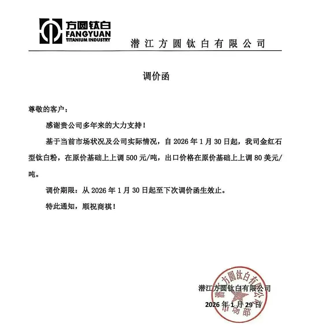 早在1月底,潜江方圆钛白有限公司就发函,说基于当前市场状况和公司实际情况,金红石型钛白粉在原价基础上上调500元/吨,出口价格涨80美元/吨。