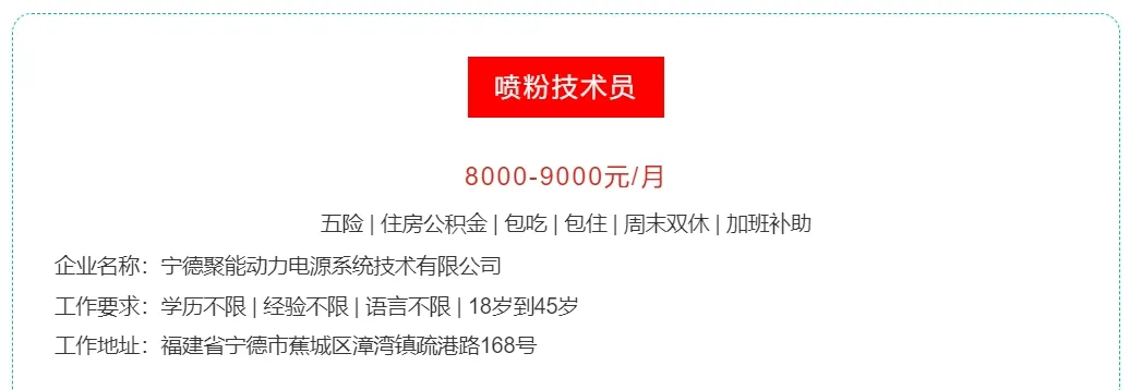 近日,宁德聚能动力168号厂区正在招聘喷粉技术员。根据披露,公司为其提供8000 - 9000元/月的薪资,还配备五险、住房公积金、包吃住、周末双休以及加班补助等优厚福利。这一岗位对学历和经验要求并不高,18岁到45岁的求职者均可尝试。