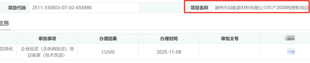 近日,湖州市冠屹新材料有限公司年产2000吨塑粉项目,在湖州市南浔区经济和信息化局,进行企业投资项目备案。