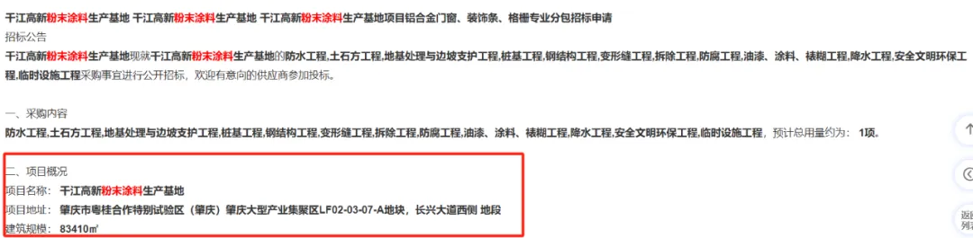 千江高新粉末涂料生产基地位于肇庆市粤桂合作特别试验区(肇庆)肇庆大型产业集聚区,总建筑面积达83410.52平方米,涵盖12栋单体建筑。为加速推进基地建设,项目近日发布公开招标公告,涵盖防水、土石方、地基处理、桩基、钢结构、防腐、油漆涂料等12项工程。