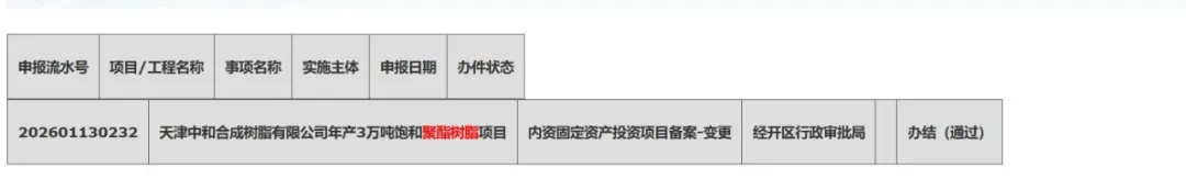 近日,天津中和合成树脂有限公司年产3万吨饱和聚酯树脂项目,进行内资固定资产投资项目备案变更。