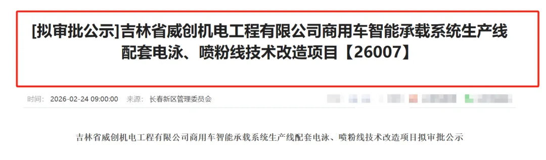 近日,吉林省威创机电工程有限公司商用车智能承载系统生产线配套电泳、喷粉线技术改造项目对外公示,项目位于长春北湖科技开发区,投资2000万元,新建电泳线、静电喷粉线、污水处理站及相关配套设施。项目建成后,虽维持商用车智能承载系统24万套生产能力不变,但在涂装处理方式上有了显著优化,17.5万套采用电泳 + 喷粉处理,这表明企业紧跟行业趋势,积极采用环保型涂装方式。