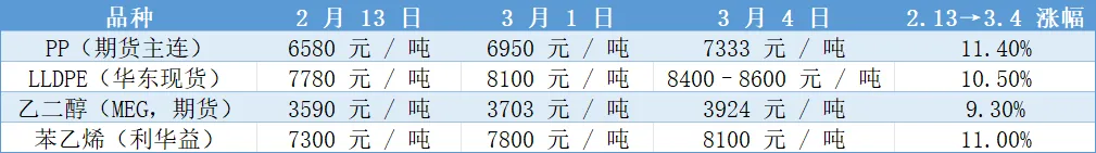 聚酯树脂和NPG:巴斯夫NPG3月12日起北美直接+155美元/吨,国内同步跟涨300-800元;PTA受地缘成本推动,2月震荡偏强,3月重心继续上移;乙二醇2月均价3638元/吨;IPA华东均价7416元,环比涨1.92%。