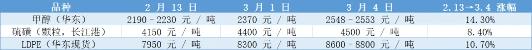 在此背景下,国内化工品已经迎来集中涨价潮:中石化二甘醇上调450-650元,甲苯/二甲苯上调300元,丁二烯上调600元到11000元;丙烯腈、丙烯、苯胺全线上涨;EPS+100元,PS+300元,二氯甲烷+200-220元;万华化学、华峰等8家TPU龙头集体提价1000-1500元。