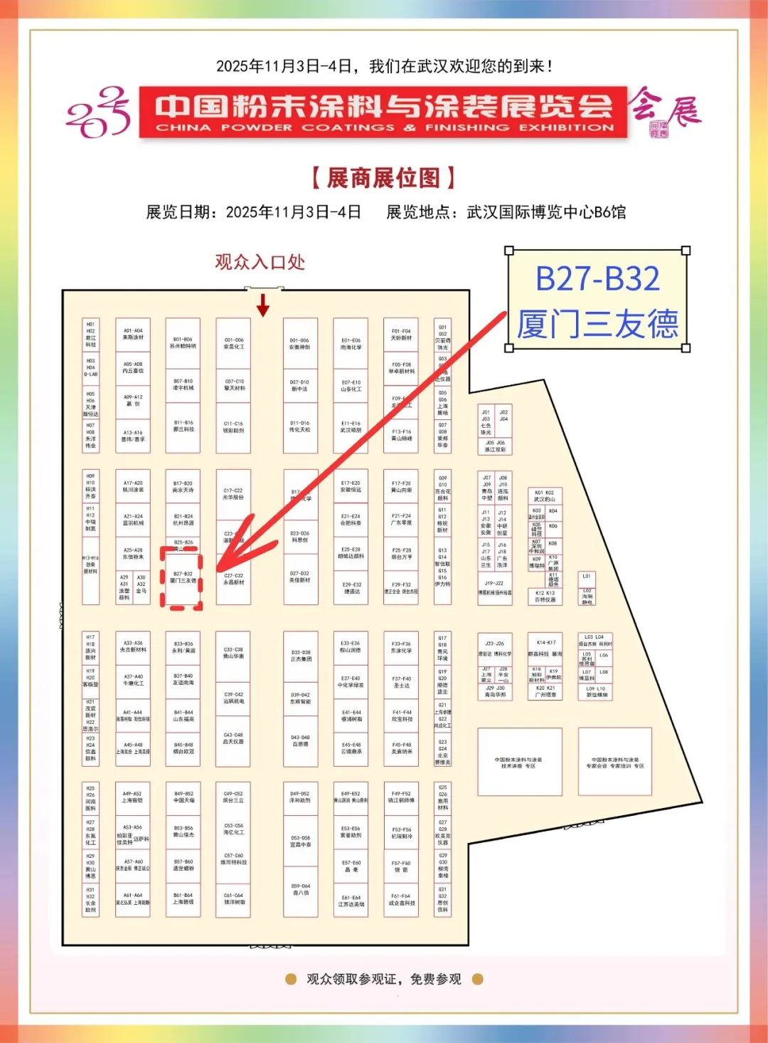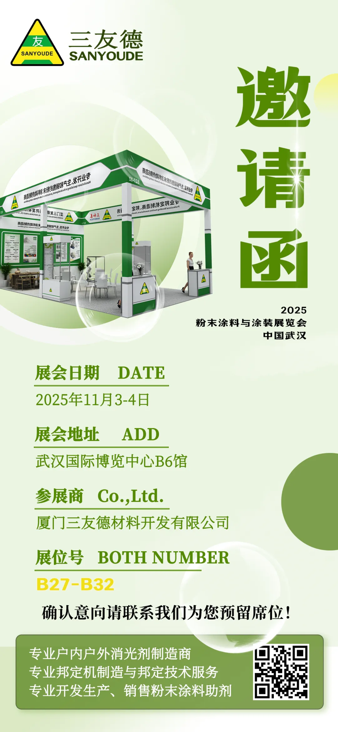 2025粉末涂料与涂装行业年会暨展览会将于11月3日至4日在武汉国际博览中心B6馆盛大举行。作为粉末涂料助剂领域的领军企业,厦门三友德材料开发有限公司将携全系列创新产品与技术解决方案参展,助力行业实现低碳转型与高质量发展。