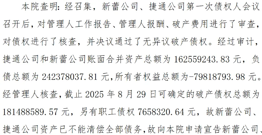 据全国企业破产重整案件信息网刊载的无锡市锡山区人民法院(2025)苏 0205破 44 号之二民事裁定书披露,新蕾品牌的持有和运营企业(捷通公司和新蕾公司)账面合并资产总额为 162559243.83 元(约 1.63 亿),负债总额为 242378037.81 元(约 2.4 亿),明显资不抵债,且差额不小。
