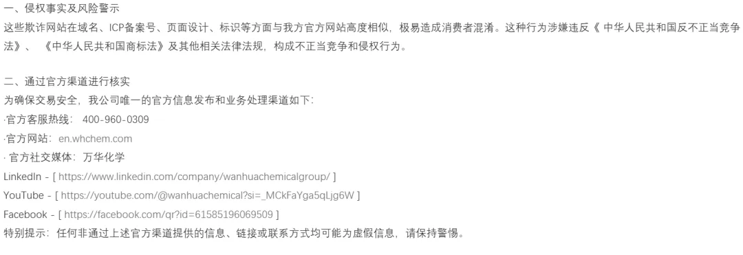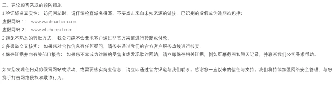 这种行为已严重侵犯万华化学的合法权益,同时对广大客户的财产安全构成直接威胁。万华强调:公司绝不会要求客户通过非官方渠道付款;若对合作信息存疑,必须通过官方热线确认。一旦遭遇诈骗或发现可疑网站,立即保存截图、聊天记录等,并联系公司协助处理。
