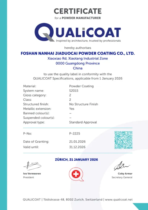 近日,佛山市南海嘉多彩粉末涂料有限公司传来喜讯:其核心产品S2015超耐候粉末涂料顺利通过国际权威的QUALICOAT二类粉认证,认证编号为P-2225。这一重磅认证不仅标志着嘉多彩粉末涂料的产品性能正式迈入国际一流水准,更为高端建筑铝材、户外设施等领域提供了更可靠、更持久的表面防护解决方案。